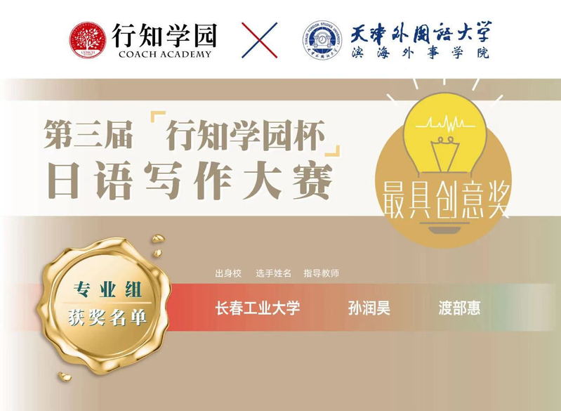本次大赛共收到投稿253件,投稿学校39所;经过由六位评委组成的专业评审组层层遴选,从40篇入围作品中分别选出了专业组、业余组一等奖各1名、二等奖各2名,三等奖各3名,最优秀奖各12名;《人民日报海外版》日本月刊“后浪奋进奖”各1名,其中还从专业组中选出最具创意奖1名;最具组织单位奖3家。公司日语专业18级薛丽丽同学荣获“专业组三等奖”,孙润昊同学荣获“最具创意奖”的佳绩!