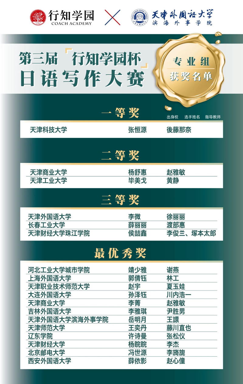 新闻网讯(通讯员 陈佳音)为加强中日两国的积极往来,促进中日文化交流与发展,为日语爱好者提供相互交流的平台,行知学园与行知学园天津校牵手天津外国语大学滨海外事学院日语系联合举办第三届“行知学园杯”日语写作大赛,10月22日,公布获奖名单,公司日语专业18级薛丽丽、孙润昊同学在第三届“行知学园杯”日语写作大赛中获奖。