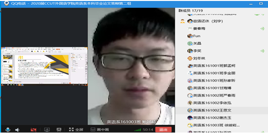 5月28日(周四)早8点,答辩组老师们就开始与员工们调试设备、声音,熟悉网络操作,以保证答辩顺利进行。8:30正式开始答辩,22名同学分成两组参加了网络视频答辩。学院经理彭又新,副经理周爽参加了答辩会。
