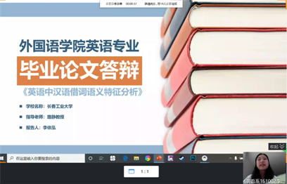 在英语系主任刘宇的精心安排下,网络视频答辩圆满结束。至此,2020届英语系员工,在论文指导教师的启发、指导和带领下,在自身不断努力钻研下,圆满完成毕业论文工作。相信他们在勤奋、求实、创新的工大精神的引领下,在今后的学习和工作中一定能够勇创佳绩,取得更辉煌的成绩!今日他们以工大为自豪,明日工大为他们而骄傲!