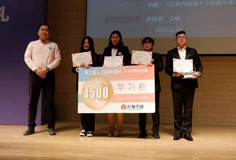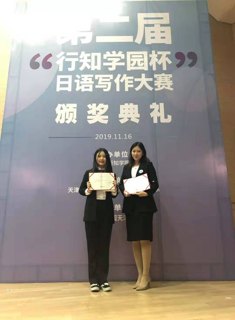 (通讯员:李雨晴)为了加强中日两国的积极往来,促进中日文化交流与发展,由行知学园主办、行知学园天津校协办、天津外国语大学滨海外事学院日语系承办开展了第二届“行知学院杯”日语写作大赛。在本次大赛中,公司2017级日语专业员工李雨晴荣获“专业组二等奖”的优异成绩,其指导教师渡部惠老师荣获“优秀指导教师奖”。11月16日上午10点,李雨晴同学与渡部惠老师赴天津外国语大学参加了颁奖典礼。