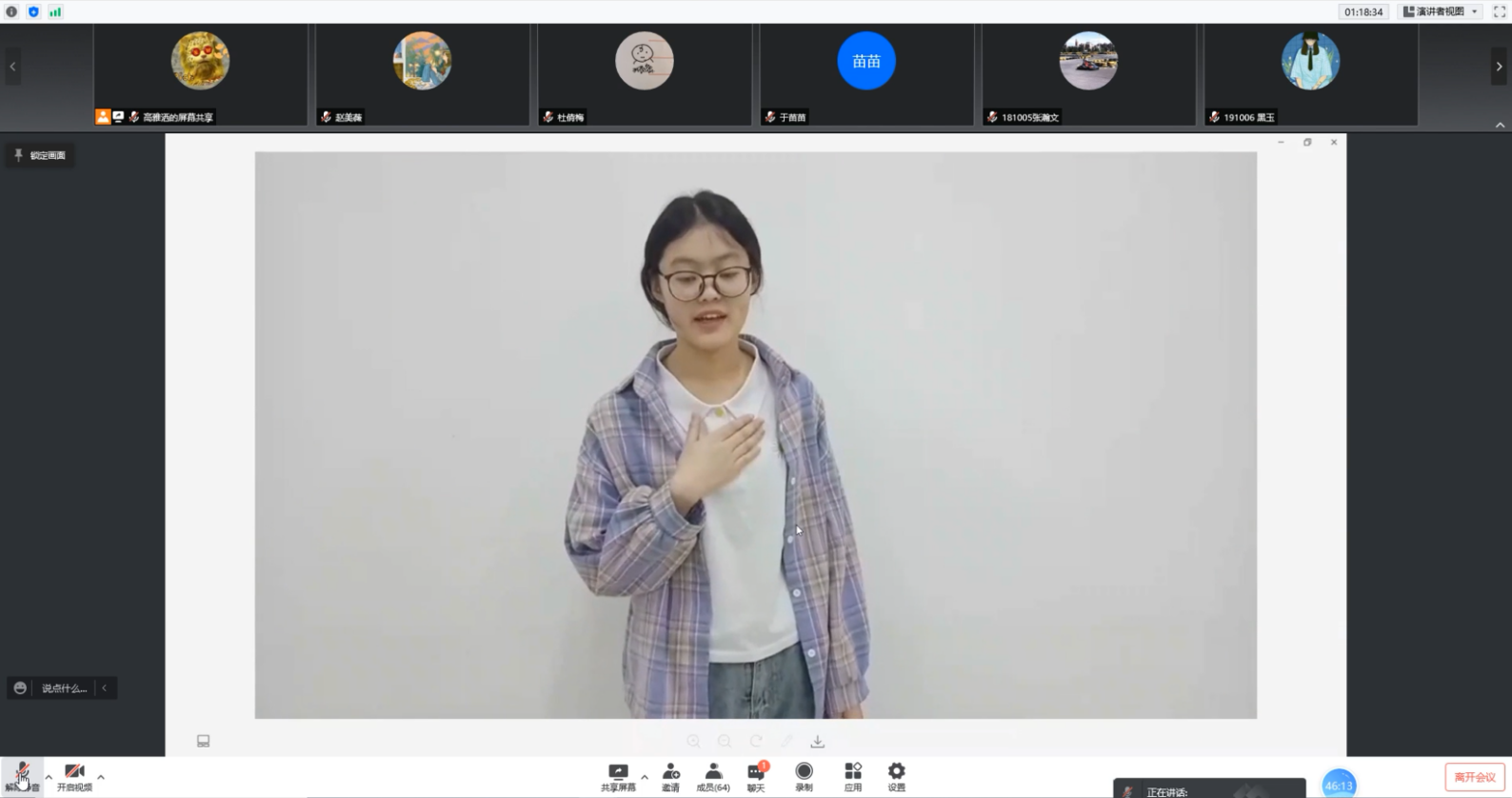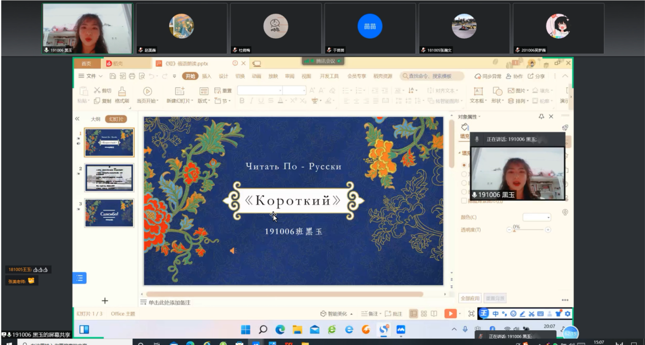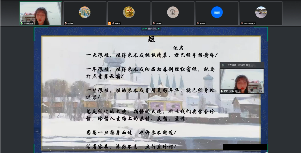 191006班的黑玉在朗读诗歌《Короткий》(短)时说:“我们走过人生各个阶段的历程,会经历困境、逆境,但也有喜悦和收获。如今我们虽然经历疫情,但我们也收获了很多友情、亲情。青春的岁月和热烈的心是为了预见奇妙的缘分和心动的人。把信念练得无坚不摧,把杂念制成防弹衣。我们不用什么怕路途遥远,因为走一步有一步的风景。”