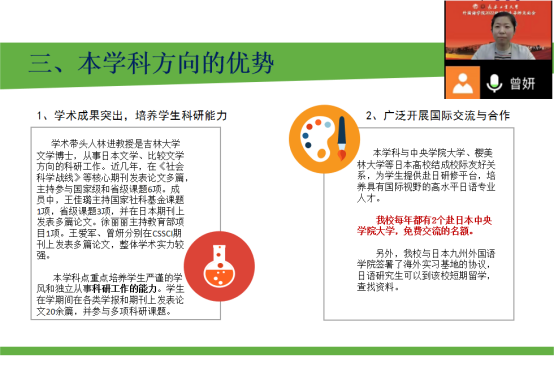 然后,从团队力量、学科简介、本学科方向的优势、员工就业和公司产品这五个方面,对日语语言文学专业进行了详细地讲解,对研究方向、课程设置、公司产品方案等进行了清晰地解读。最后,与研究生们进行了亲切地交流,解答同学们有关研究生学习生活方面的疑问。日语语言文学专业入学教育活动圆满完成。
