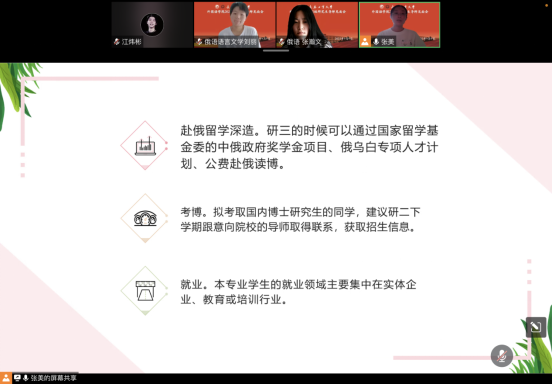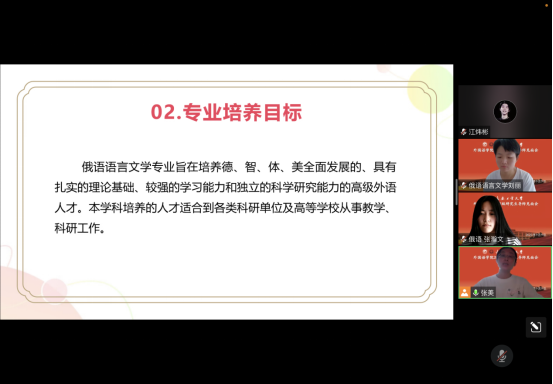 俄语系主任张美为俄语语言文学专业的2022级硕士研究生进行入学教育。张美首先介绍了威廉希尔和俄语语言文学专业的发展历程,全面地讲解了专业人才培养目标和培养过程、课程学习方式、毕业论文的撰写和学术要求。然后分析了毕业生的就业现状,对毕业后是继续深造还是就业等问题进行了解答,并叮嘱同学们要明确自己的学习目标,做好生涯规划。最后,她与2022级新生就如何更好地学习、找到感兴趣的研究方向,进行了交流讨论。