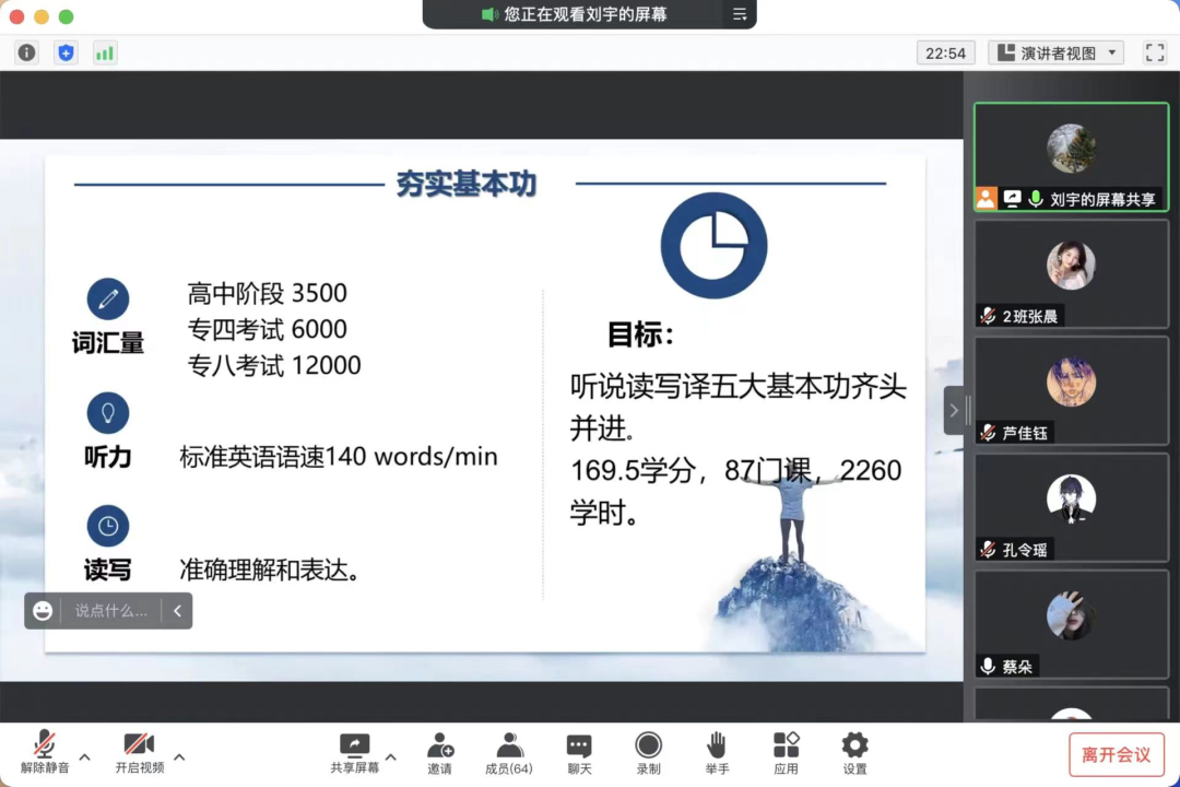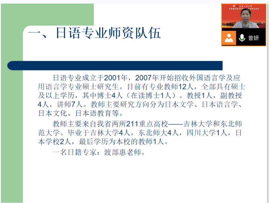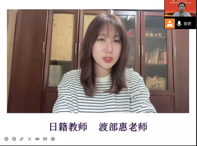 日语系主任曾妍从校园环境、专业特色、人才培养目标、毕业去向等方面,希望新生能够学会自主、选择、独立、规划,积极参加社会实践,省级、全国各类日语比赛。曾妍老师也讲了长春疫情的形势,同学们要延期到校,希望同学们在家上好网课,期待早日课堂上相见。外籍教师渡部惠通过视频向同学们送来祝福,欢迎大家来到工大日语专业学习,祝愿同学们能拥有美好快乐的四年老员工活!