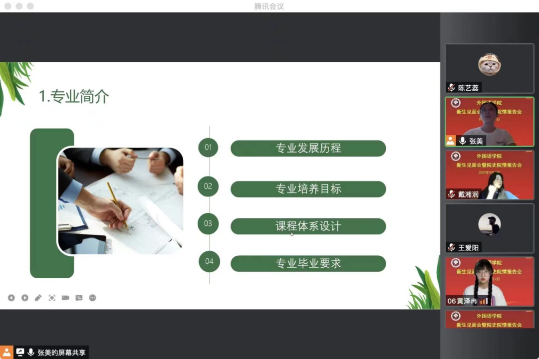 本网讯(通讯员 李梓溪)新学期有新起点,新学期有新希望。为了使同学们深入了解本院以及本院所设专业的特色和优势,帮助同学们找准定位,合理规划专业学习方向和目标。威廉希尔于9月7日下午通过腾讯会议举行了英日俄专业介绍会,各系主任和2022级全体新生参加此次会议。