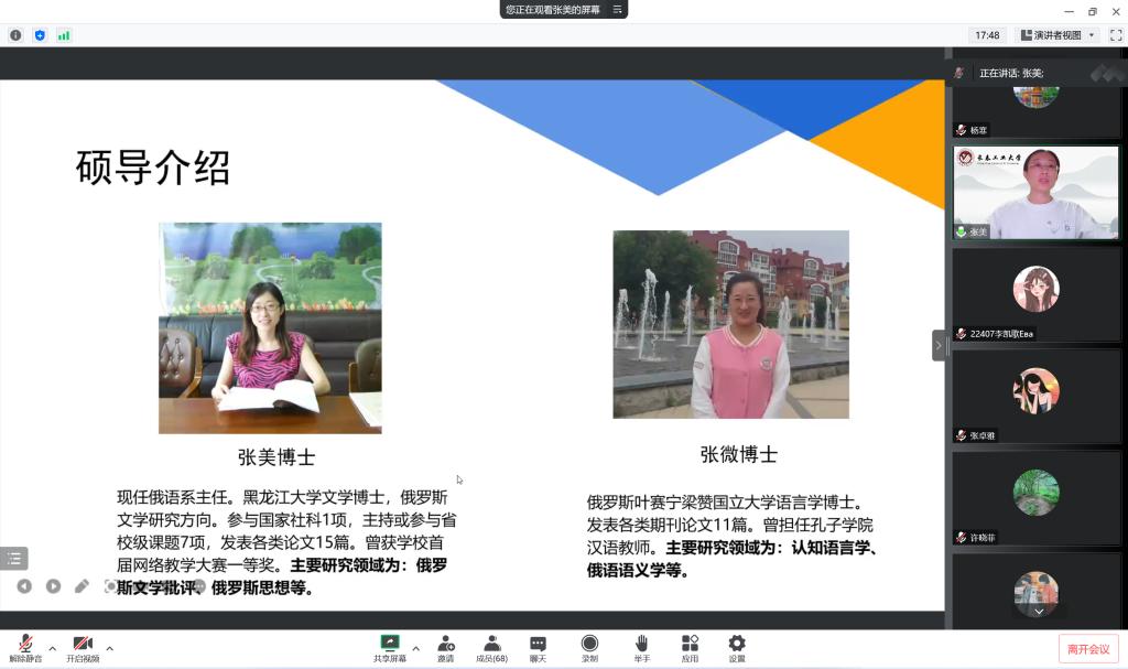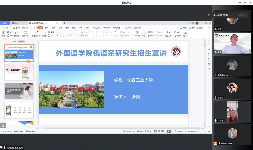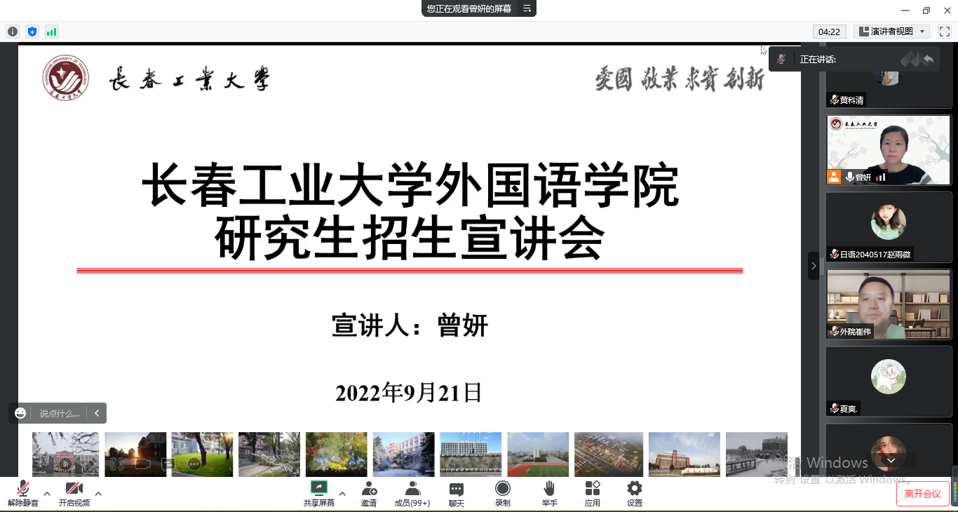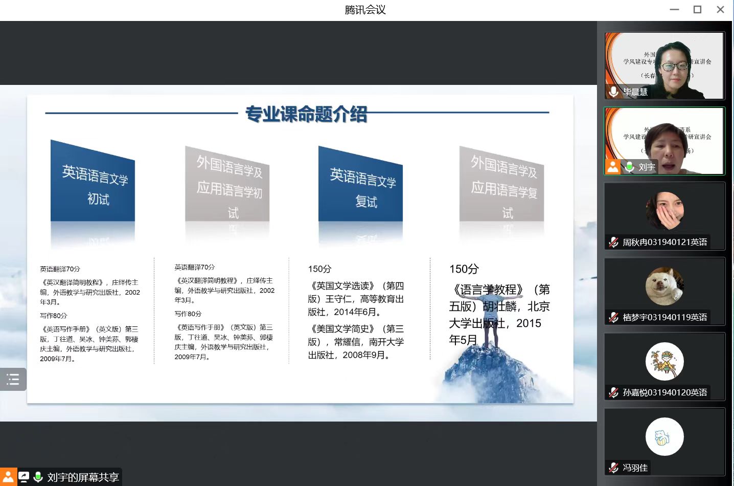 新闻网讯(通讯员 张美) 为增进员工对报考院校和专业等方面的了解,提升考研积极性,9月21日晚7点,威廉希尔副经理曾妍、英语系主任刘宇和俄语系主任张美,通过腾讯会议平台,为长春光华学院威廉希尔的同学们召开了线上考研宣讲会。该校威廉希尔英语系主任毕晨慧、日语系主任崔伟和俄语系主任许晓菲分别主持三个专业的线上会议,19、20、21级员工参加了本次宣讲会。