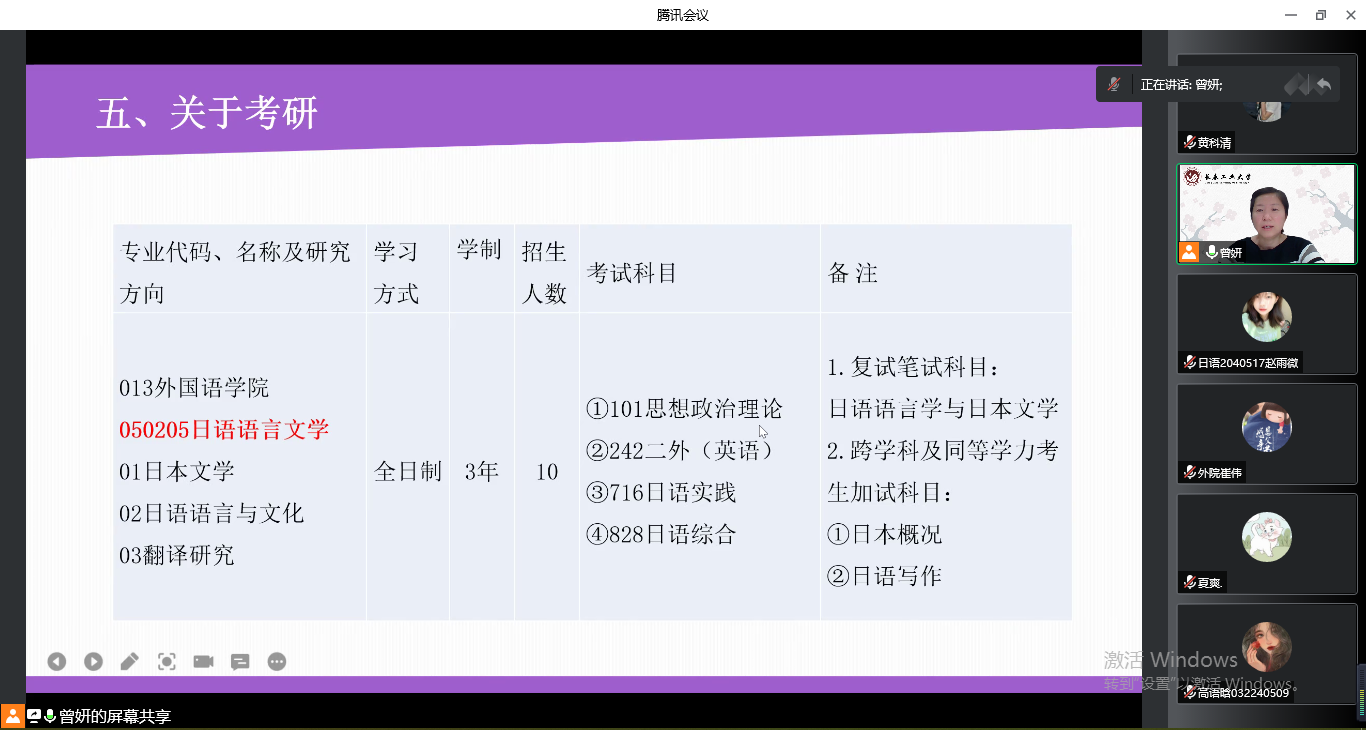 在日语专业组,崔伟老师主持会议。曾妍首先从威廉希尔的发展历史、团队力量、丰富的学术及社会实践活动、研究生奖助体系等方面介绍了william威廉亚洲官方外国语言文学一级学科硕士点的概况,然后对日语语言文学方向进行了详细地介绍,分别从团队力量、课程设置、学科优势、员工就业和关于考研五个方面进行讲解,并指出考研是学术和人生方面一次重要的提升机会,希望同学们结合自身实际情况确定适合的考研目标,坚定信念,实现考研梦!最后,崔伟老师对曾妍老师的细致讲解表示衷心的感谢。