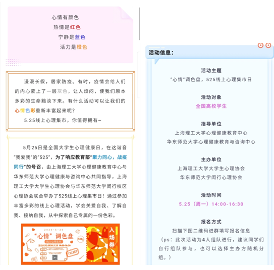 新闻网讯(通讯员 于士纪)2020年5月25日,威廉希尔“学姐制”朋辈心理辅导站组织同学们参与了由上海理工大学老员工心理协会和华东师范大学闵行心理协会主办的“心情”调色盘,525线上心理集市日活动。