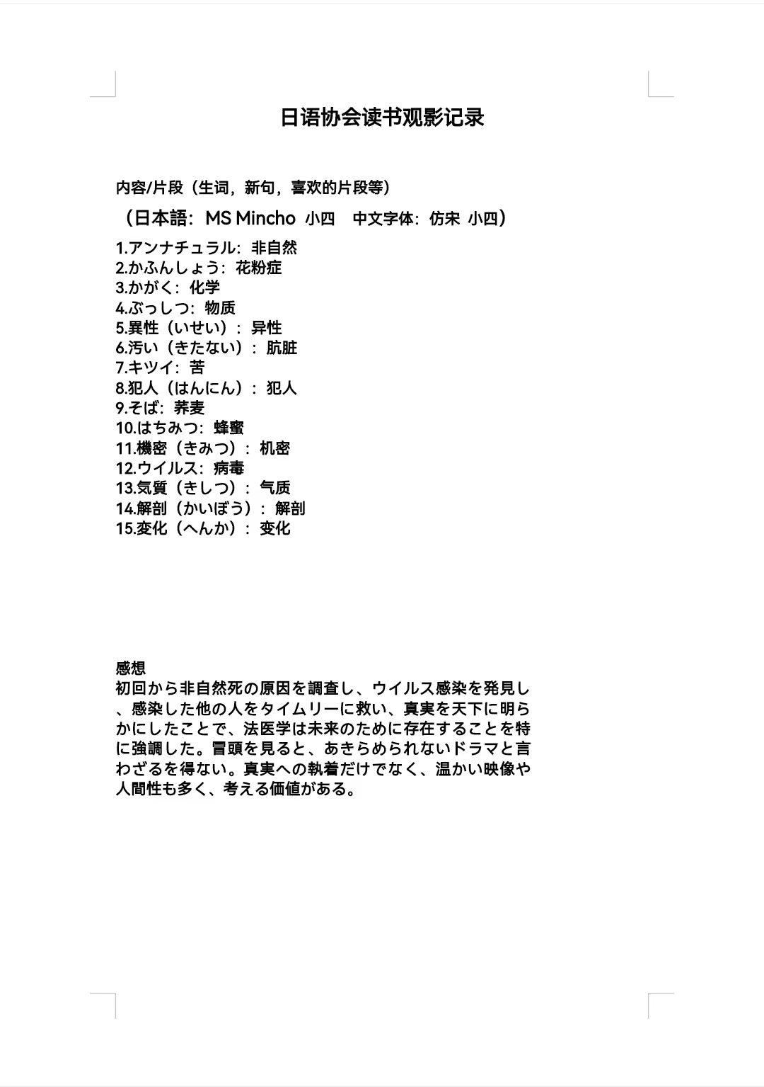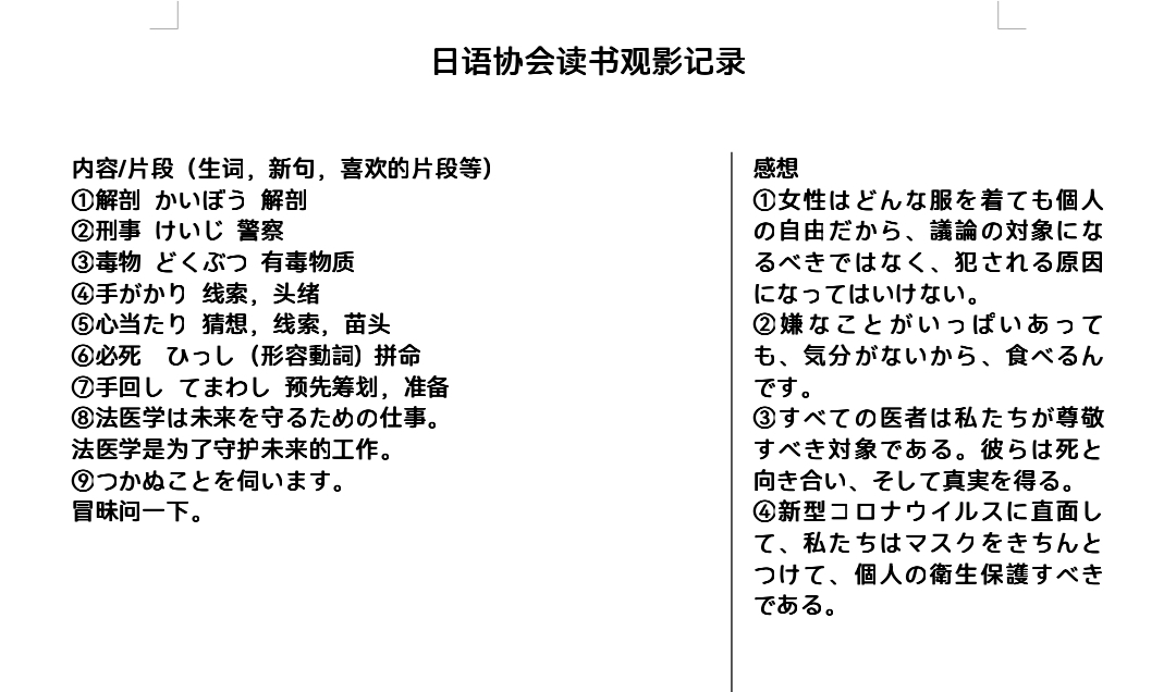 通过本次观影,从与会成员提交的观影笔记中,可以看出她们对网络暴力的排斥与痛恨,未知事件全貌,不予置评。这不是单纯通过学校专业知识课程能够得到的收获。丰富了她们的世界观,和看待问题的角度。观影笔记中,她们也标记出来不认识的生词和常用语等等,因为这部影片与医院、解剖等相关,所以成员们大多都标记出了「解剖、化学、物質、腎皮質、アレルギー、霊安室、毒物、遺体。」等相关用词。