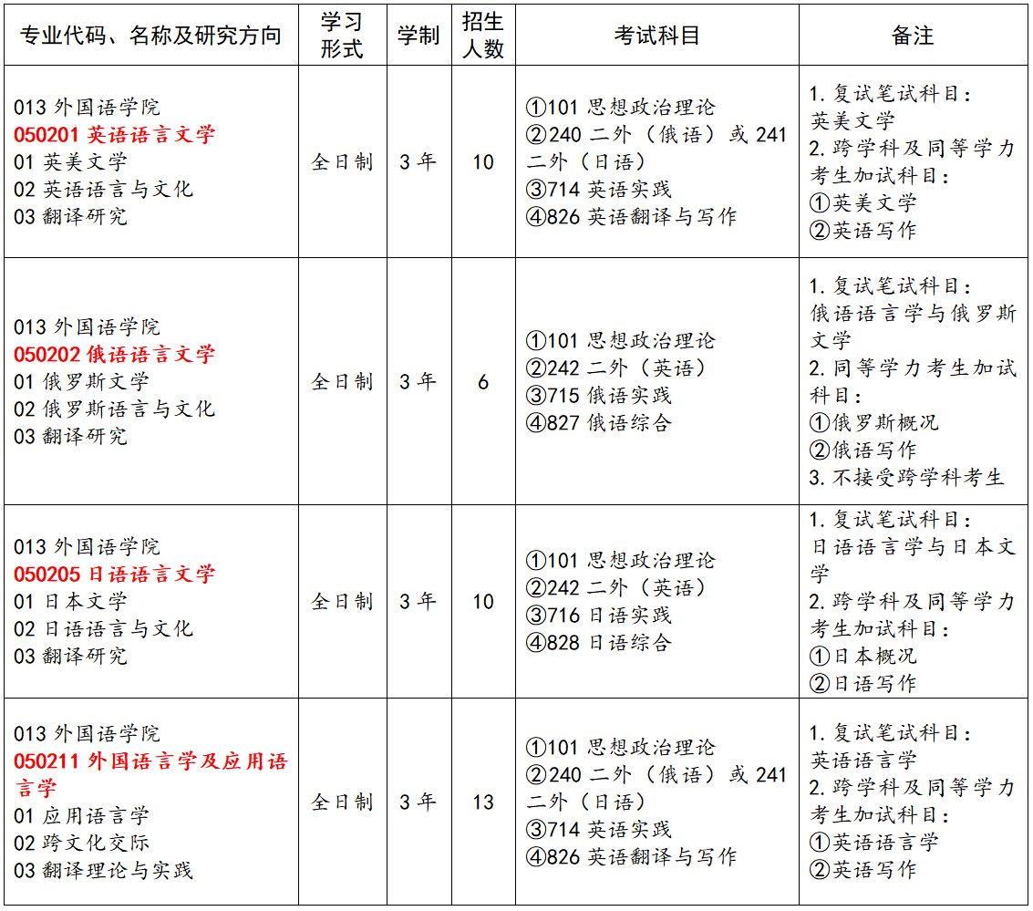 外国语言文学学位点经过长期的团队建设与发展,已经形成了英语语言文学、日语语言文学、俄语语言文学和外国语言学及应用语言学4个稳定并具有一定特色的学科研究方向。
