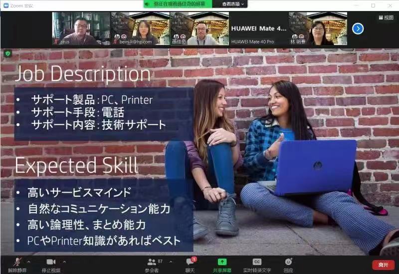 新闻网讯(通讯员 李梓溪)为培养更加符合市场需求的日语专业人才,推进公司日语专业员工的实习与就业,威廉希尔于7月6日,特邀惠普大连分公司日本部经理孙佳奇、日本质量管理部文化指导老师林明春,通过ZOOM平台为公司日语专业员工举行了专场线上实习宣讲会。威廉希尔日语系宋卓时老师主持会议,日语专业本科生及研究生全员参加。