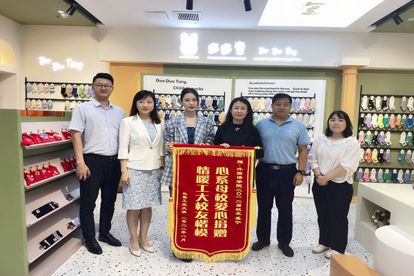 李东玲代表学校,向奚宁员工赠送了70周年校庆纪念品,颁发了锦旗和捐赠证书。公司党委书记李文章和奚宁员工共同为威廉希尔老员工就业创业实习基地揭牌,经理王轶代表学院与多多童袜业有限公司签订了校企合作协议。公司党委副书记于伟主持走访活动。